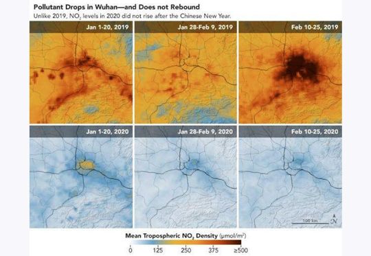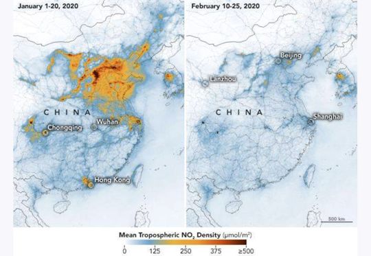 На снимках от NASA четко видно, что уровень загрязнения воздуха диоксидом азота упал в разы!